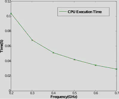 The above code can be available at the repository [4]. The code is very simple, and it basically consists on the execution of a for while i is lower than limit and the execution time is measured by use the clock_gettime() function from time.h, to get the exact time of the CPU usage the clock_gettime() used the parameter CLOCK_THREAD_CPUTIME. To compile the program the GCC was used with the flags -lrt (this flag is needed to use the clock_gettime()) and -lm(due to the exponential function). By executing the above code, and varying the frequency at steps of 0.1GHz in a range of 0.2GHz to 0.7GHz the CPU execution time was measured and plotted in Figure 2.